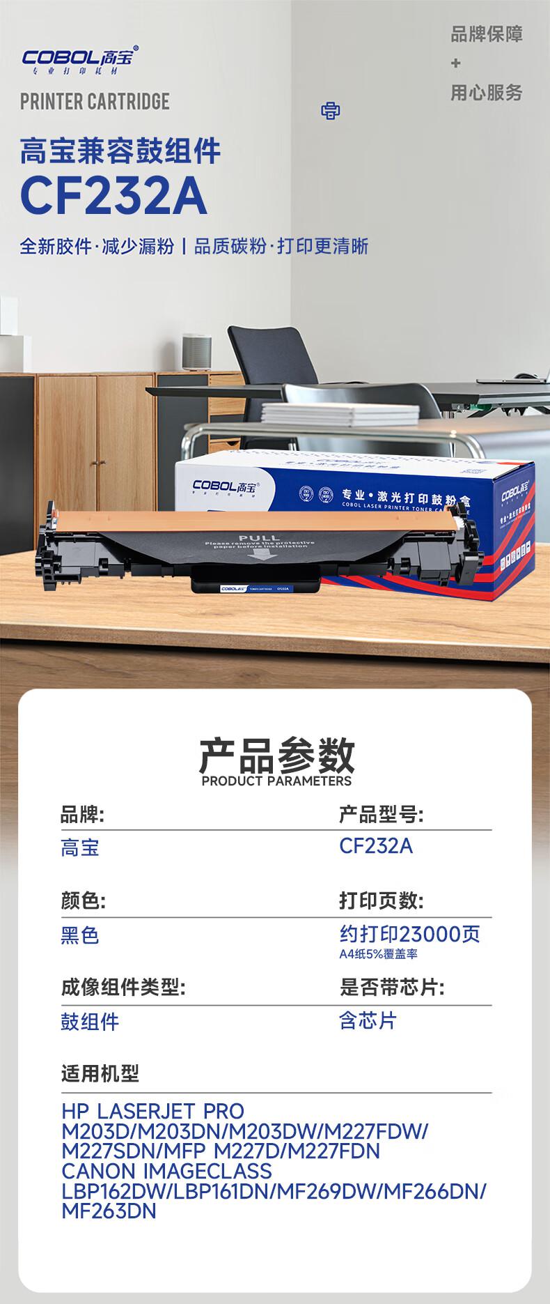 商品标题:高宝兼容CF232A鼓组件(鼓粉分离)黑色单只装打印量:23000页(只)