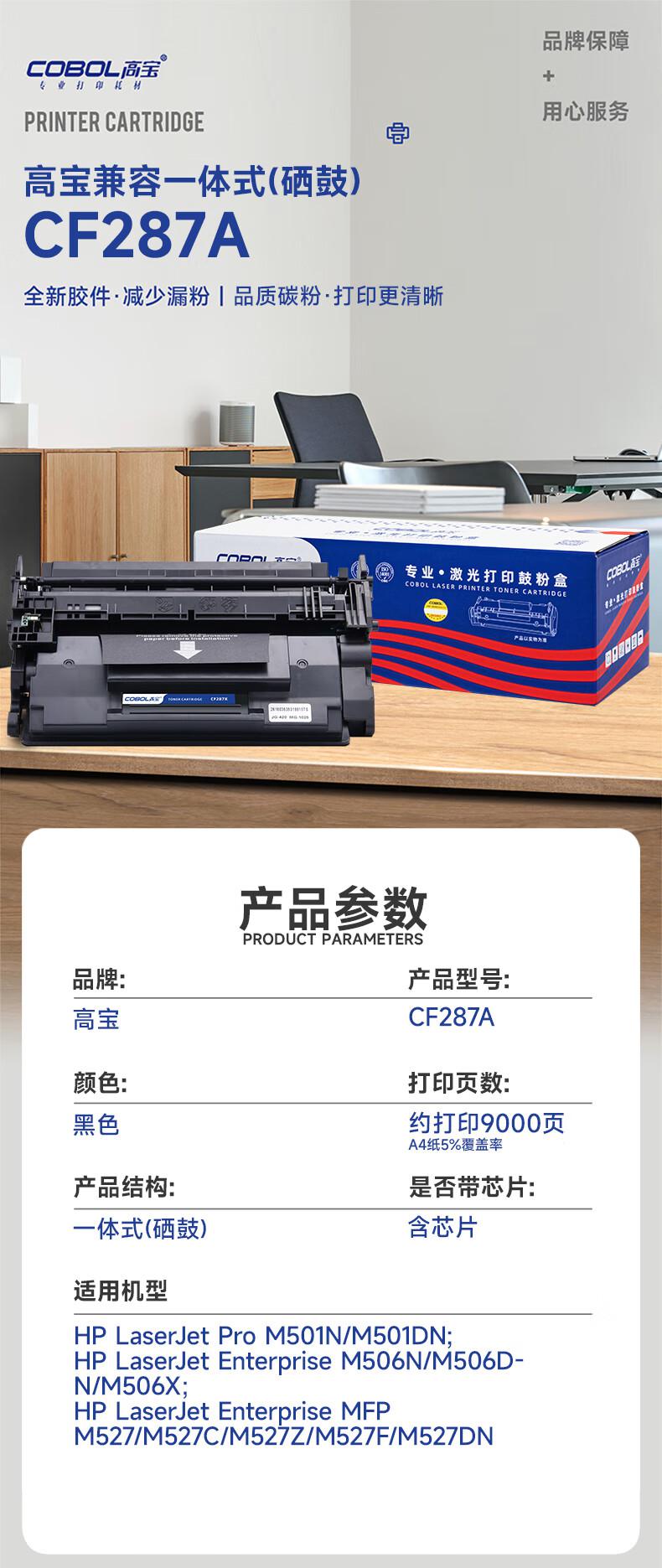 商品标题:高宝兼容CF287A硒鼓(鼓粉一体)黑色单个装打印量:9000页(个)
