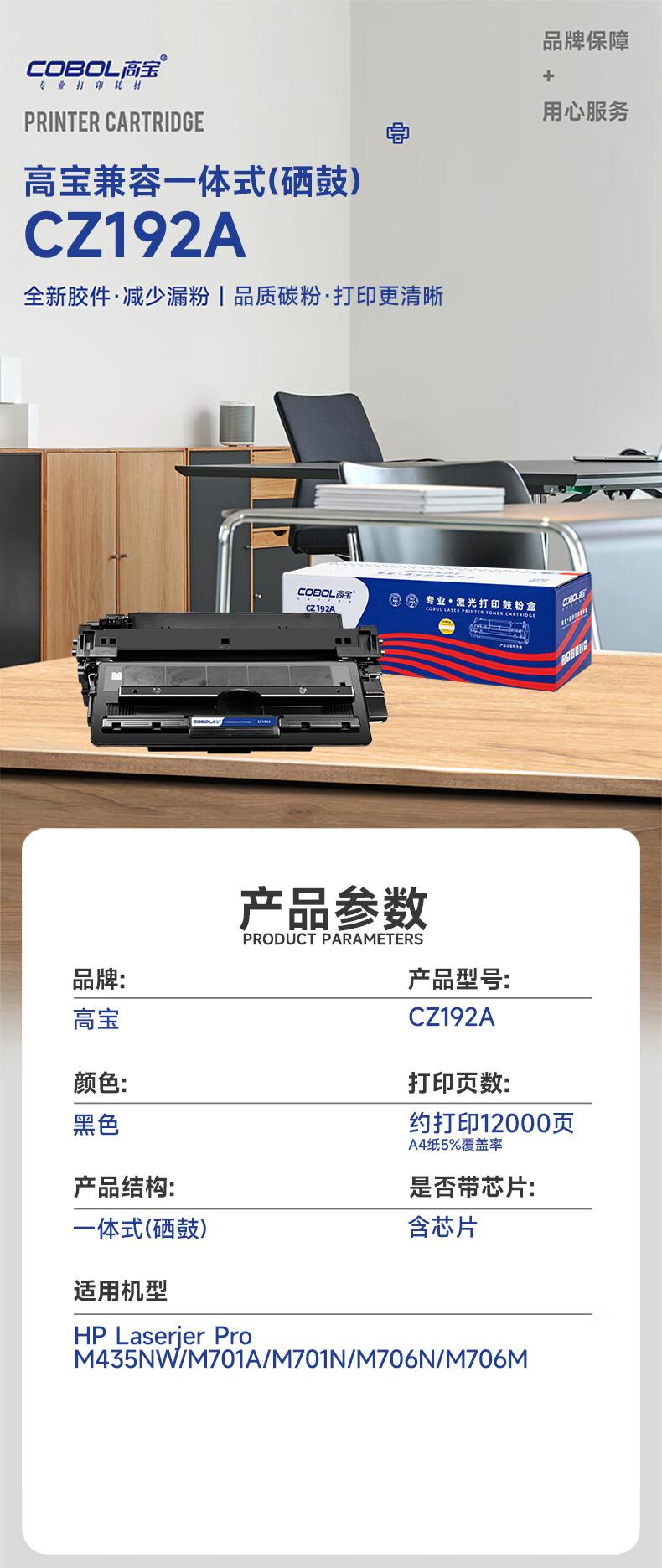 商品标题:高宝兼容CZ192A硒鼓(鼓粉一体)黑色单个装打印量:12000页(个)