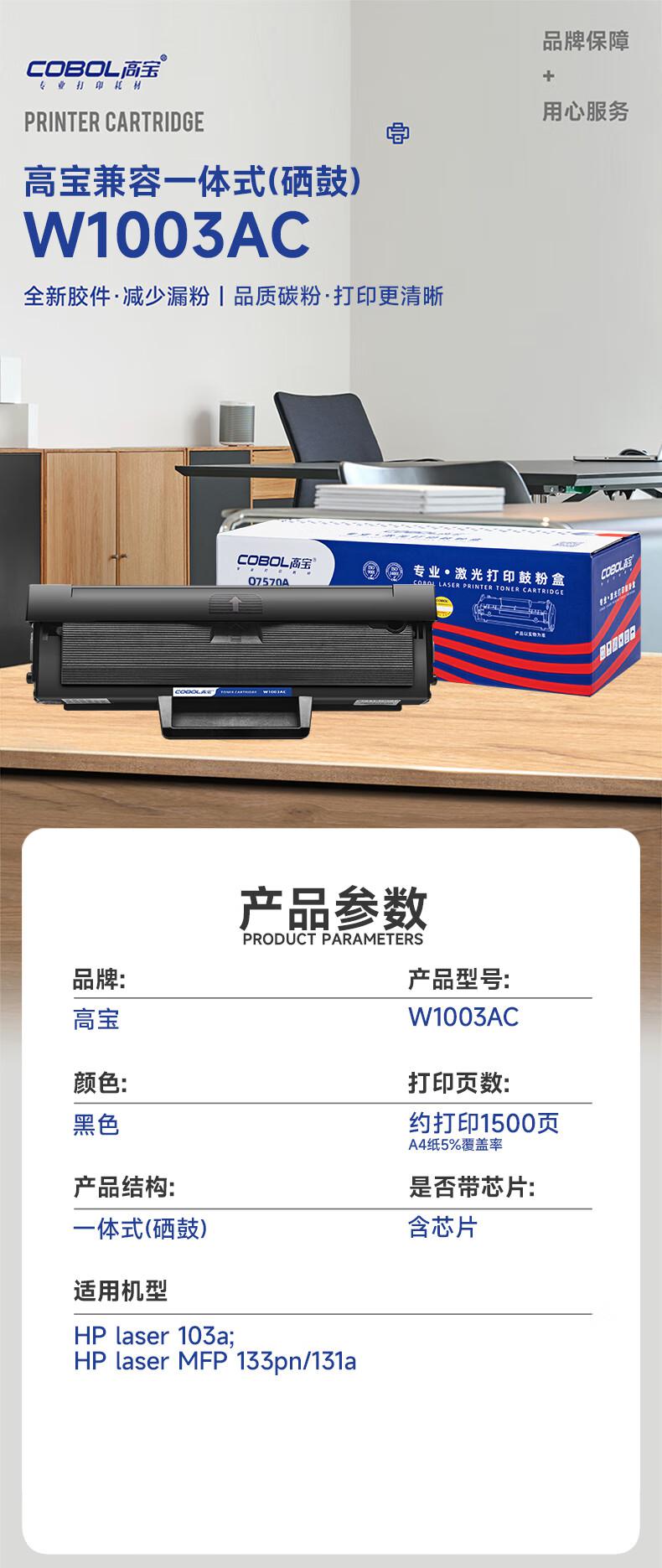 商品标题:高宝兼容W1003AC硒鼓(鼓粉一体)黑色单个装打印量:1500页含芯片(个)