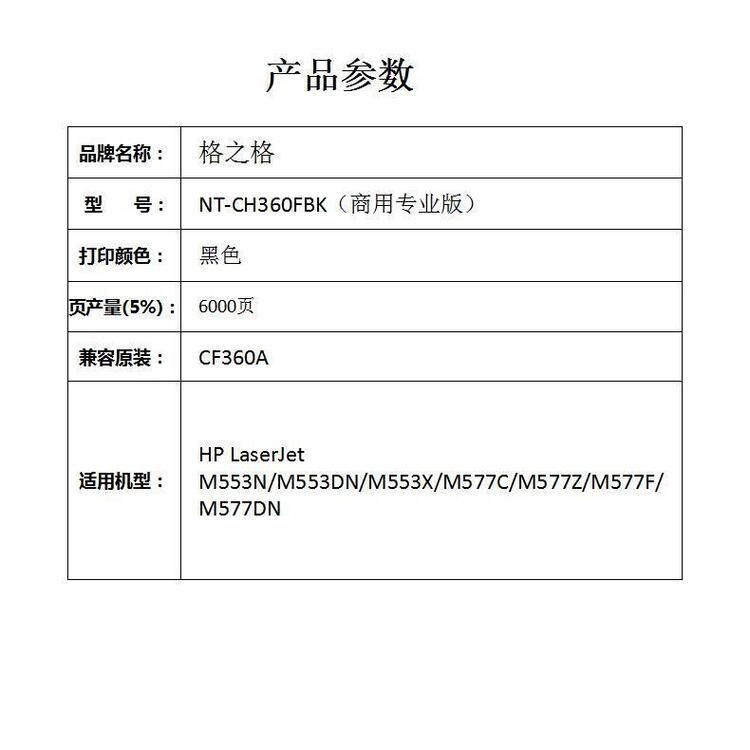 格之格NT-CH360FBK(商用专业版)兼容CF360A硒鼓鼓粉一体黑色单支装(适用HP LaserJet M553N/M553DN/M553X/M577C/M577Z/M577F/M577DN)打印页数:6000(单位:个)