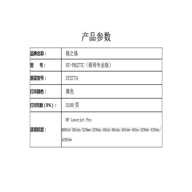 格之格(G&G)NT-PH277C商用专业版兼容CF277A硒鼓(鼓粉一体)黑色单支装(适用机型:HP Laserjet Pro M305d/305dn/329mw/329dn/405d/405dn/405dw/405n/429dw/429dn/429fdw)打印量:3100页(个)