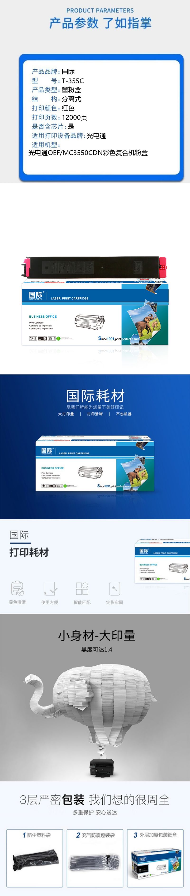 商品标题:国际兼容T-355C粉盒(鼓粉分离)红色单支装(适用 光电通OEF/MC3550CDN彩色复合机粉盒)打印页数:12000页(单位:支)