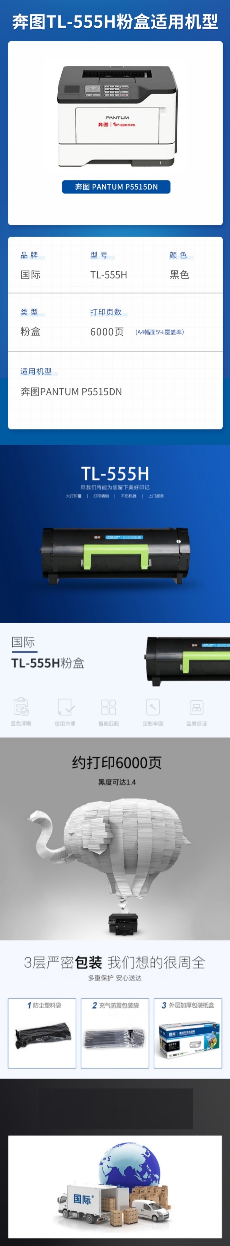 商品标题:国际兼容TL-555H粉盒(鼓粉分离)黑色单支装(适用奔图P5000DN/P5515DN黑白打印机P4215墨粉盒M7665粉盒)打印页数:6000页(单位:支)