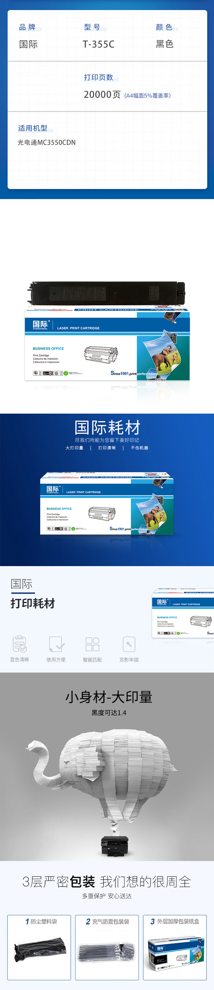 商品标题:国际兼容T-355C粉盒(鼓粉分离)黑色单支装(适用光电通OEF MC3550CDN 碳粉盒彩色复合机粉盒)打印页数:20000页(单位:支)