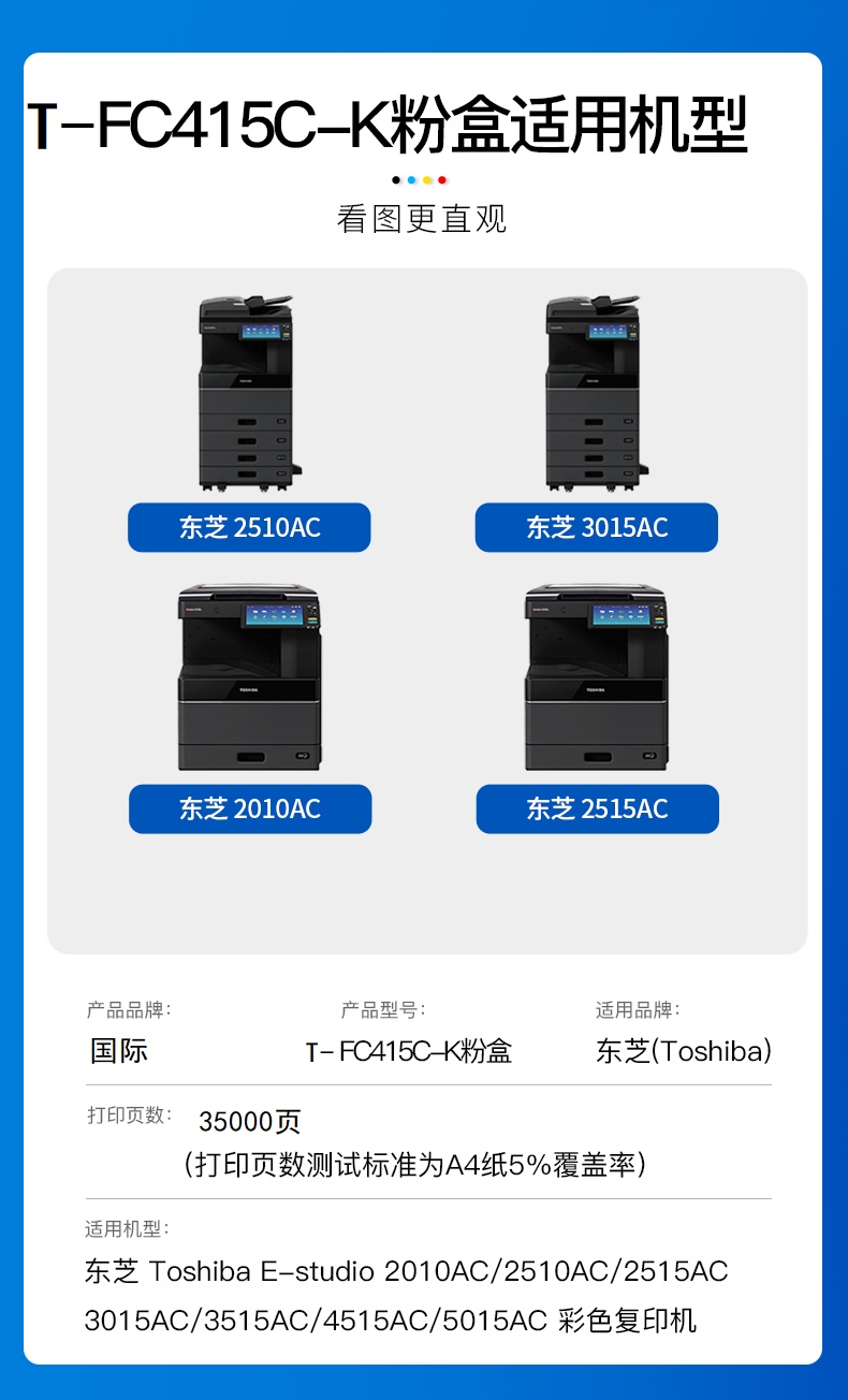 商品标题:国际兼容T-FC415C-K硒鼓(墨粉)大容量黑色单支装(适用东芝2010/2510/2515/301/351/4515/5015AC复印机)打印页数:35000(单位:支)