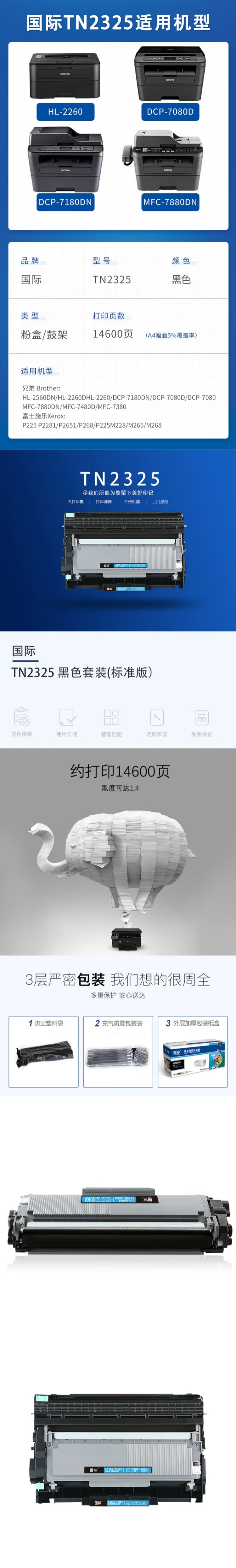 商品标题:国际兼容TN2325硒鼓(墨粉+硒鼓组件)黑色套装(适用兄弟MFC7380粉盒7880d DCP7080D 7180DN打印机)打印页数:14600页(单位:套)