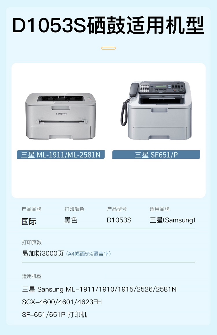 商品标题:国际 D1053S 易加粉(适用三星 ML-1915/2525W/2540/SCX-4600/4623F/4623FN/SF-650) 3000页 硒鼓 (计价单位:只) 黑色