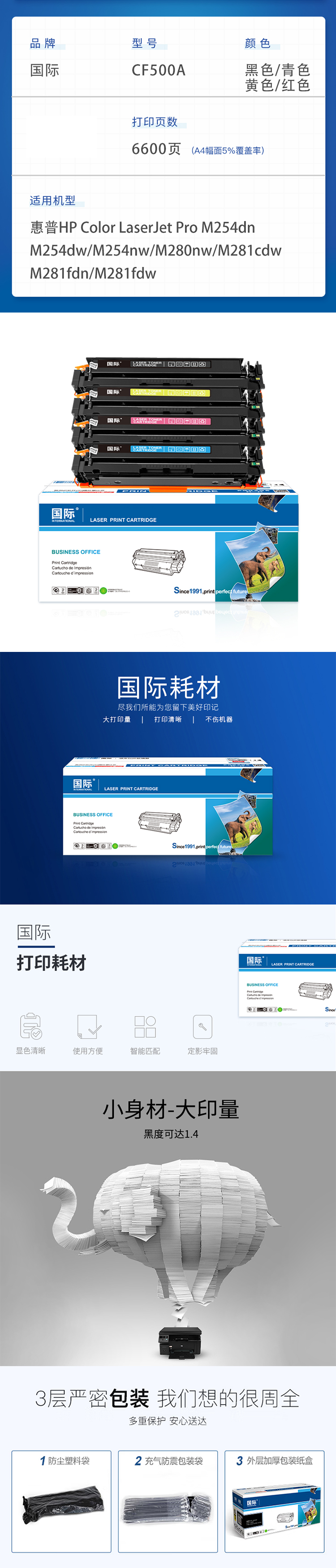商品标题:国际兼容CF500A硒鼓(鼓粉一体)四色套装 (适用惠普m281fdw cf500a硒鼓m254dw/nw m254dn)打印页数:6600页(单位:套)