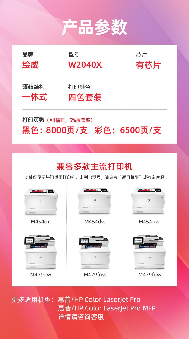 商品标题:绘威兼容W2040X硒鼓带芯片 四色套装 适用惠普HP m479dw m479fdw M454dn/dw/nw M480f M455dn W2040a带芯片 黑色: 8000页/支 彩色: 6500页/支(单位:套)