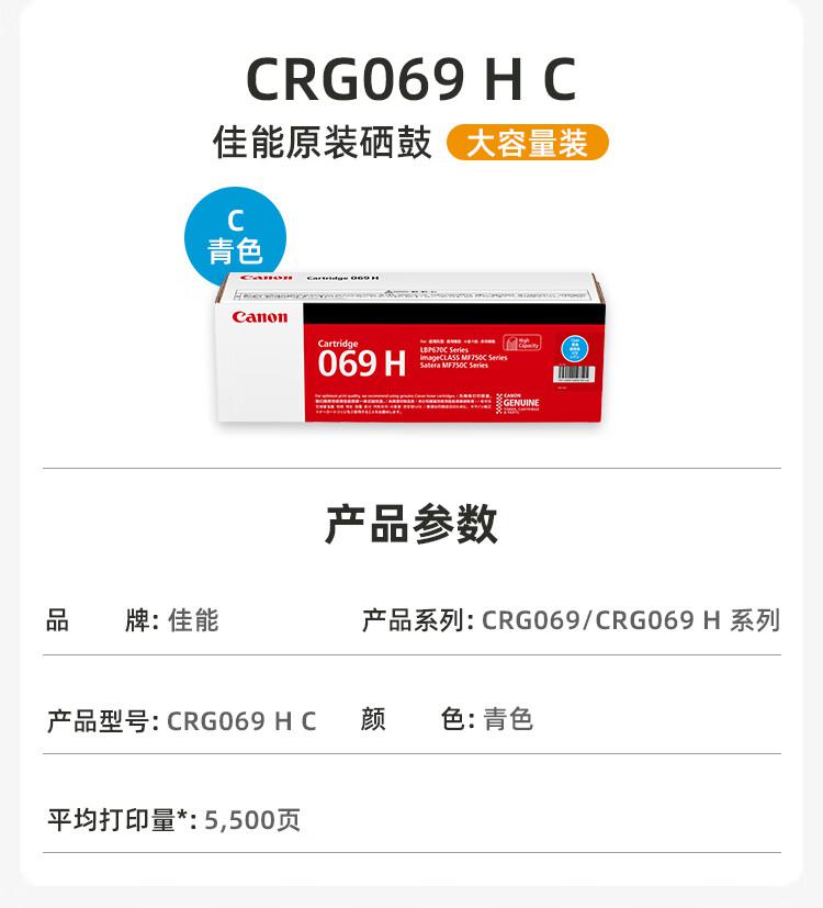 商品标题:佳能(Canon)CRG069H C青色 原装硒鼓(单位:个)(适用LBP673Cdn,LBP673Cdw,LBP674Cx,MF752Cdw,MF756Cx)