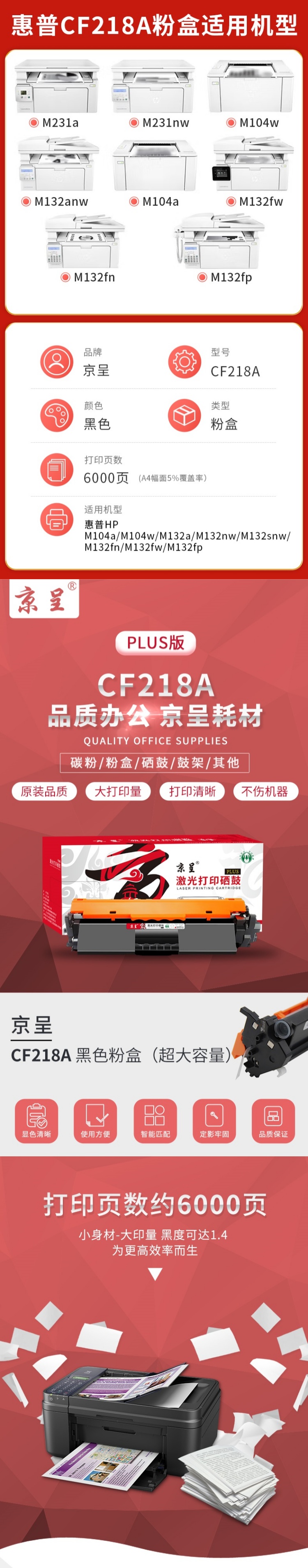 商品标题:京呈PLUS兼容CF218A粉盒(鼓粉分离)黑色单支装(适用HP M104a/M104w/MFP M132a/M132nw/M132fw硒鼓)打印页数:6000(单位:支)