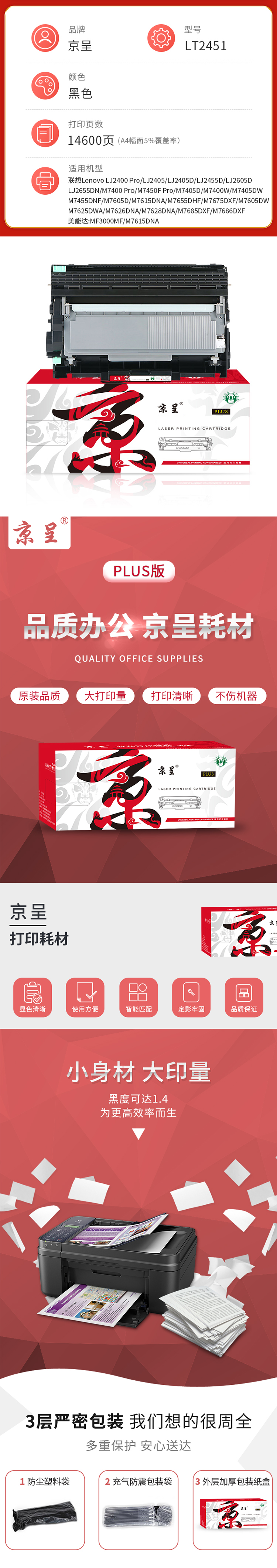 京呈PLUS兼容LT2451鼓粉套装(鼓粉一体)黑色单支装(适用联想Lenovo LJ2405D/LJ2455D/LJ2605D/LJ2655DN/M7605D M7405D/M7615DNA/M7455DNF/M7655DHF/M7675DXF/M7460/M7480/M7680D/M7685DXF)打印页数:14600页(单位:支)