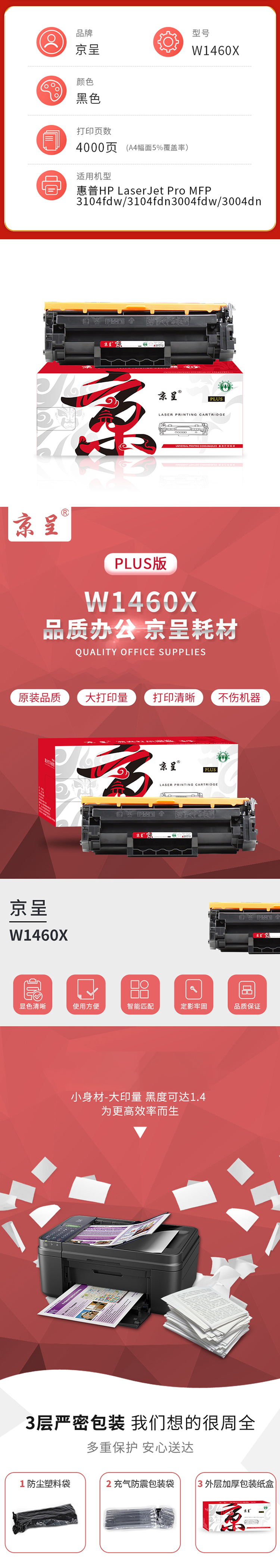 商品标题:京呈PLUS兼容W1460X硒鼓(鼓粉一体)黑色单支装(适用HP LaserJet Pro MFP 3104fdw 3104fdn 3004fdw 3004dn)打印页数:4000页(单位:支)