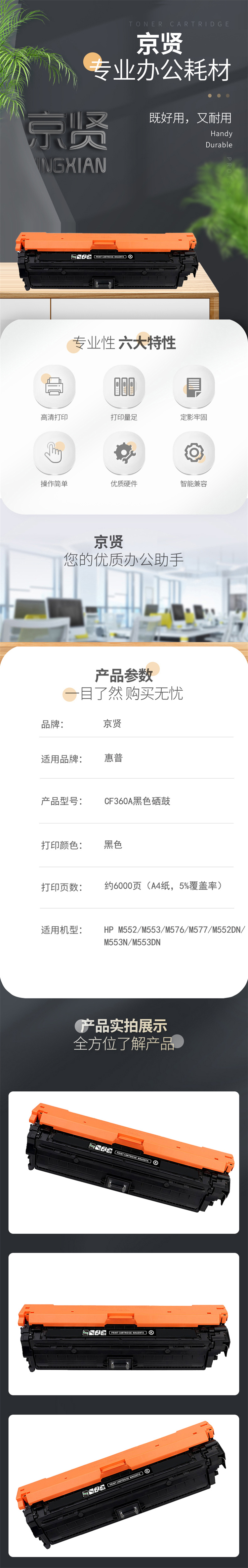 商品标题:京贤兼容CF360A硒鼓(鼓粉一体)黑色单只装(适用HP M552/M553/M576/M577/M552DN/M553N/M553DN)打印页数:6000页(单位:只)