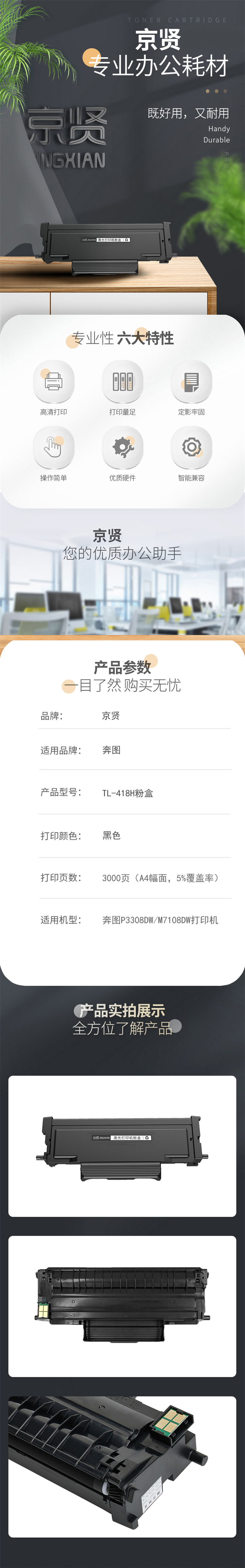 商品标题:京贤兼容TL-418H粉盒(鼓粉分离)黑色单只装(适用奔图P3308DW/M7108DW)打印页数:3000页(单位:只)
