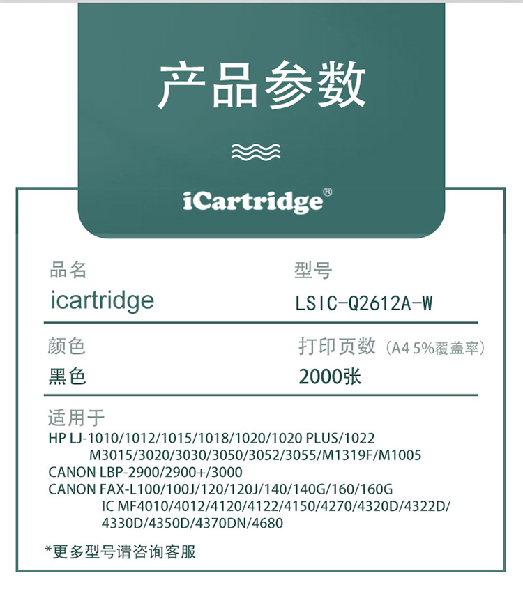 莱盛I系列 LSIC-Q2612A-W 硒鼓(鼓粉一体) 黑色单支装 (适用于HP LJ-1010/1012/1015/1018/1020/1022 M3015/3020/3030/3050/3052/3055 M1319f/M1005 CANON LBP-2900/3000) 打印页数:2000 (单位:支) 03.ICG.0030W