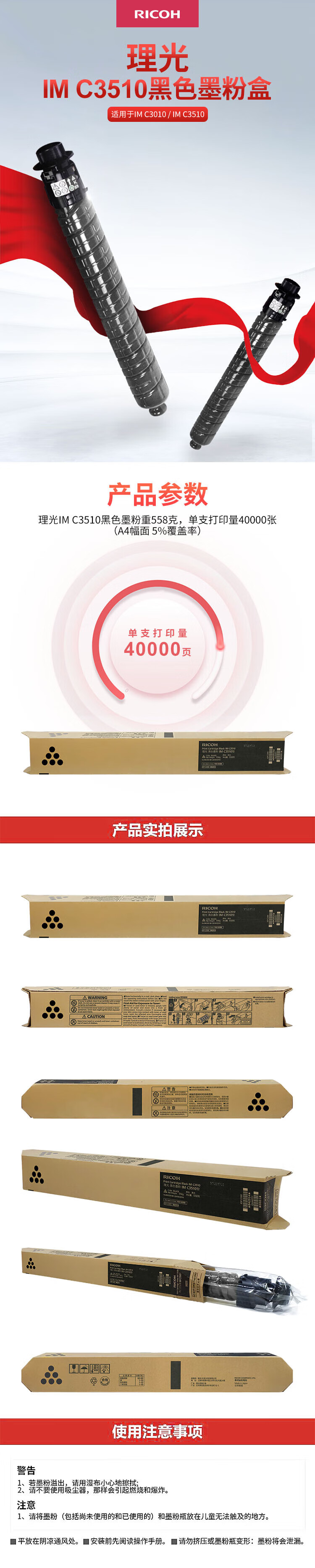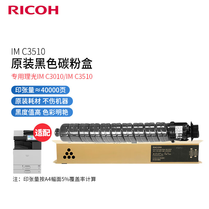 商品标题:理光(Ricoh) IMC3510 原装黑色墨粉碳粉盒(适用理光IM C3010/IM C3510)约印40000页(单位:支)