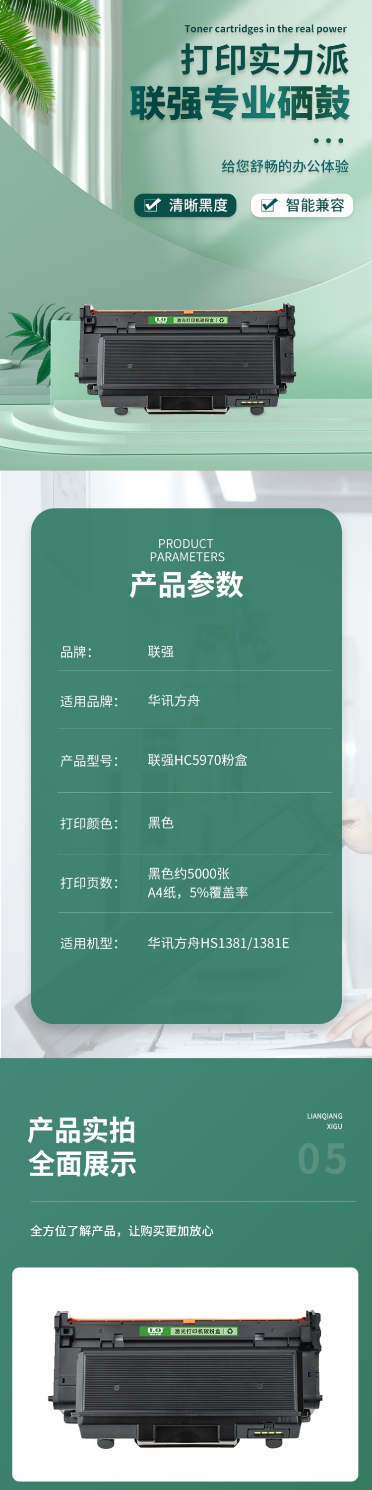 商品标题:联强兼容HC5970粉盒(鼓粉分离)黑色单只装(适用华讯方舟HS1381/1381E)打印页数5000页(单位:只)