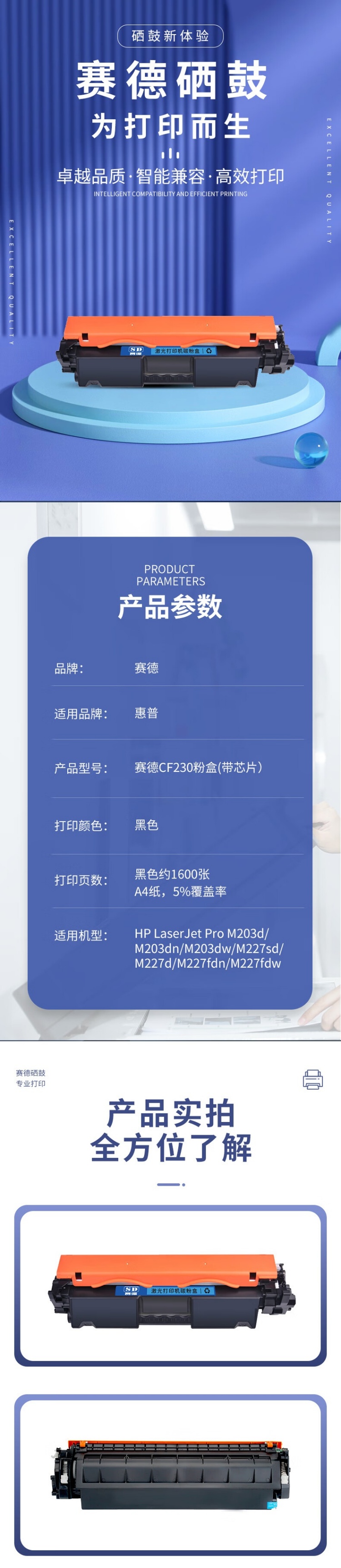 商品标题:赛德兼容CF230A粉盒(鼓粉分离)黑色单只装(适用惠普HPM203d/M203dn/M203dw/MFPm227SDN/M227d)打印页数1600页(单位:只)