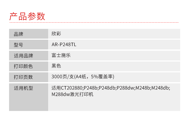 商品标题:欣彩AR-P248TL兼容粉盒(鼓粉分离)专业版黑色单支装(适用施乐CT202880 P248b P248db P288dw M248b M248db M288dw)打印页数:3000(单位:支)