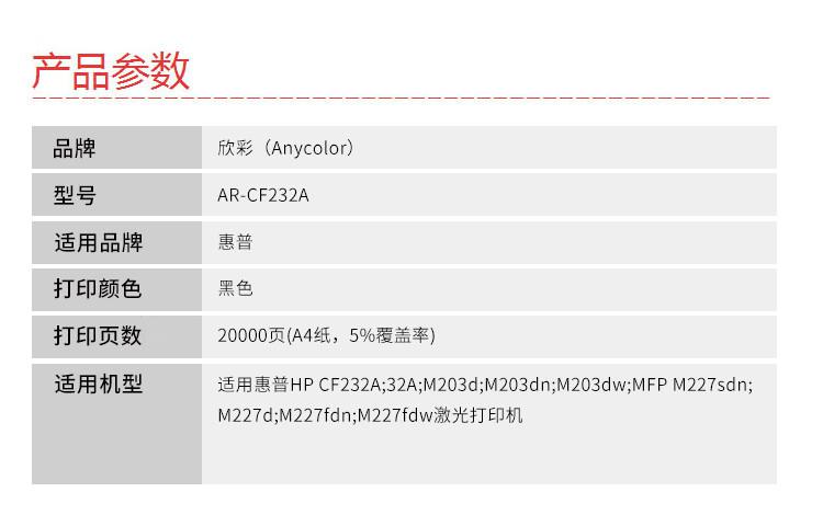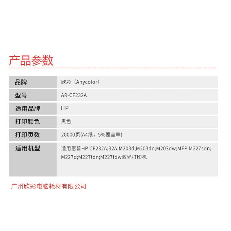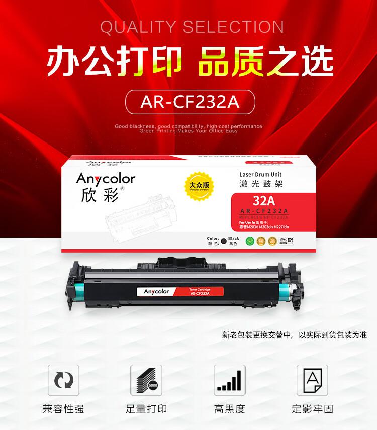 商品标题:欣彩AR-CF232A兼容大众版带芯片鼓组件(鼓粉分离)黑色单支装(适用于惠普M203d、M203dn、M227fdn)打印页数:20000(单位:支)