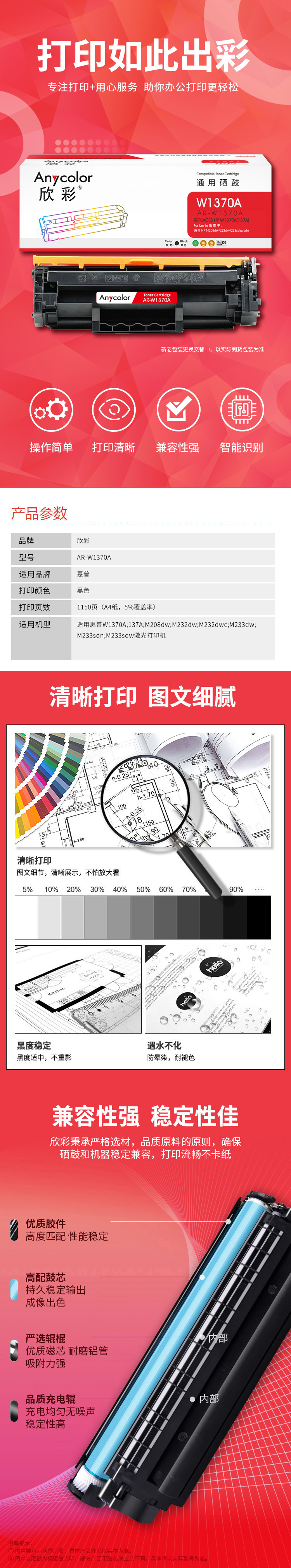 商品标题:欣彩AR-W1370A兼容硒鼓(鼓粉一体)带芯片黑色单支装( 适用惠普W1370A 137A M208dw M232dw M232dwc)打印页数:1150(单位:只)