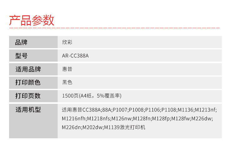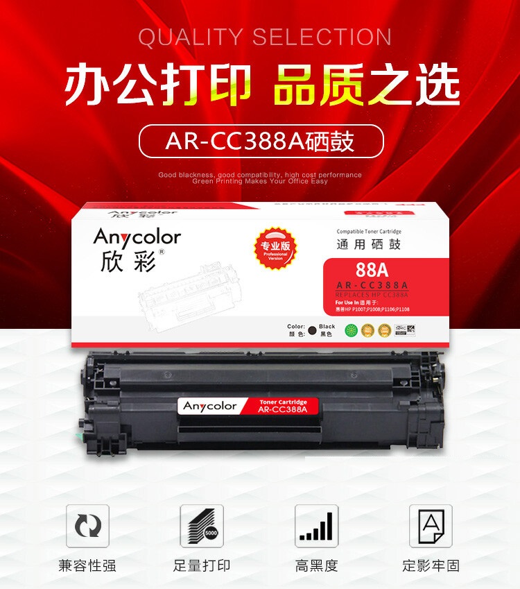 商品标题:欣彩AR-CC388A兼容硒鼓(鼓粉一体)专业版黑色单支装(适用惠普 P1007 P1008 P1106 P1108 M1136 M1213nf M1216nfh)打印页数:1500(单位:只)
