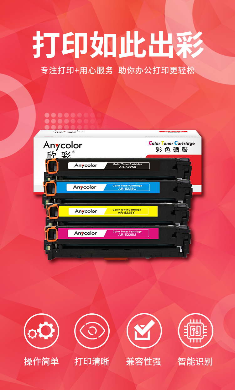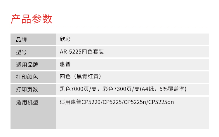 商品标题:欣彩AR-5225兼容硒鼓(鼓粉一体)四色套装单支装(适用惠普CP5220 CP5225 CP5225n CP5225dn)打印页数:黑色7000页,彩色7300页(单位:套)