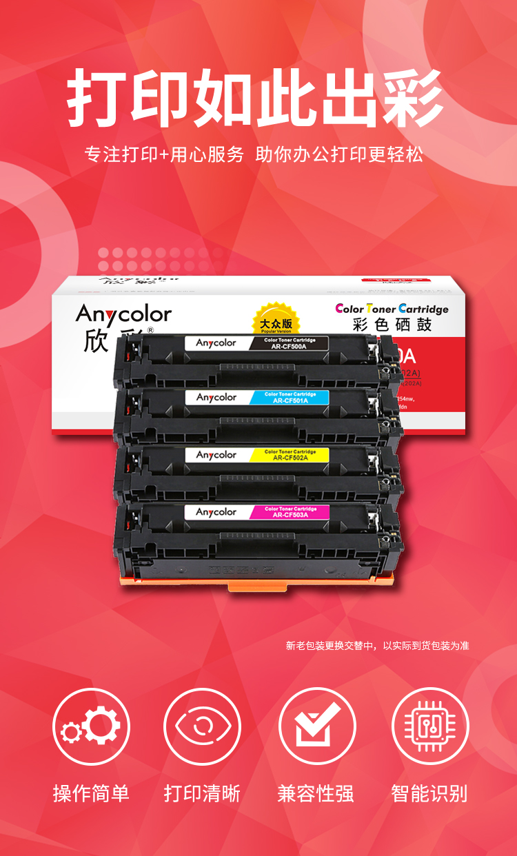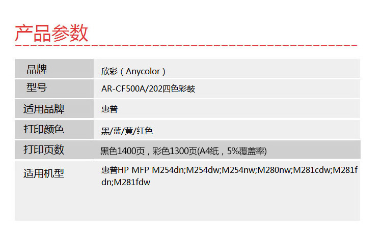 商品标题:欣彩CF500A/202A兼容硒鼓(鼓粉一体)四色套装大众版(适用惠普HP MFP M254dn M254dw M254nw)打印页数:黑色1400,彩色1300页(单位:套)