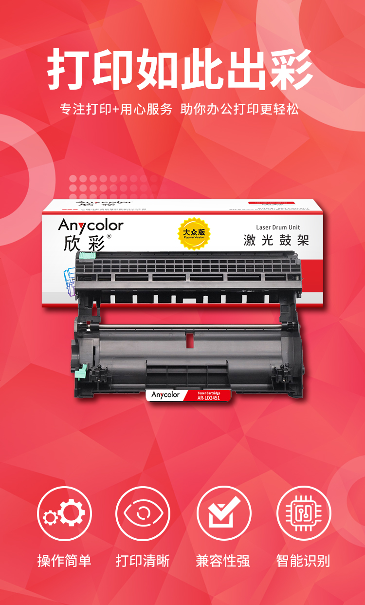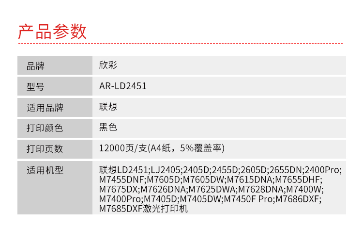 商品标题:欣彩AR-LD2451兼容鼓组件(鼓粉分离)大众版黑色单支装(适用联想LJ2405D LJ2455D LJ2605D LJ2655DN)打印页数:12000(单位:支)