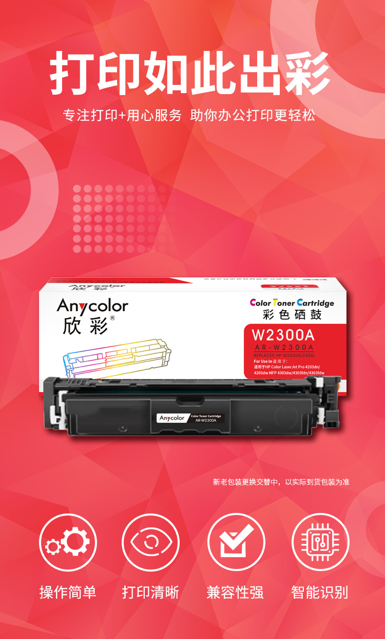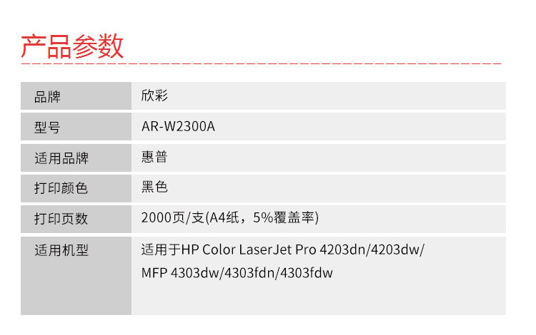 商品标题:欣彩AR-W2300A兼容硒鼓(鼓粉一体)黑色带芯片单支装(适用惠普Color LaserJet Pro 4203dn 4203dw MFP 4303dw 4303fdn)打印页数:2000(单位:支)