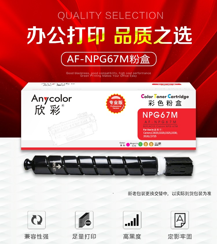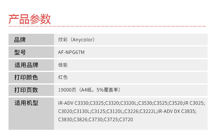 商品标题:欣彩AF-NPG67M兼容粉盒(鼓粉分离)红色大容量专业版单支装(适用佳能C3020 3320 3325 3330 3520 C3725)打印页数:19000(单位:只)