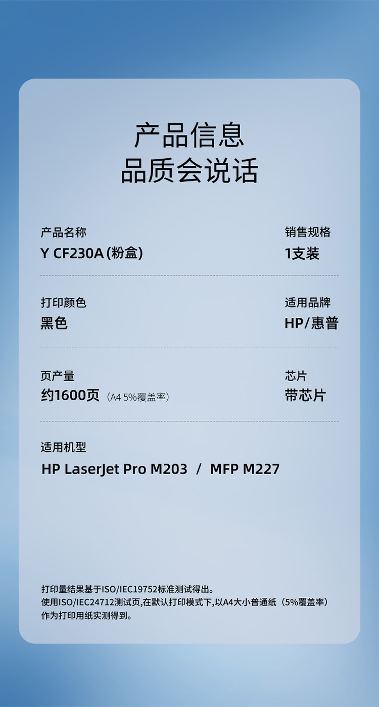 商品标题:印友 兼容Y-CF230A 粉盒(鼓粉分离)(带芯片)黑色单支装(适用HPM203dn/M203dw/M227Fdw)打印量1600页(单位:支)