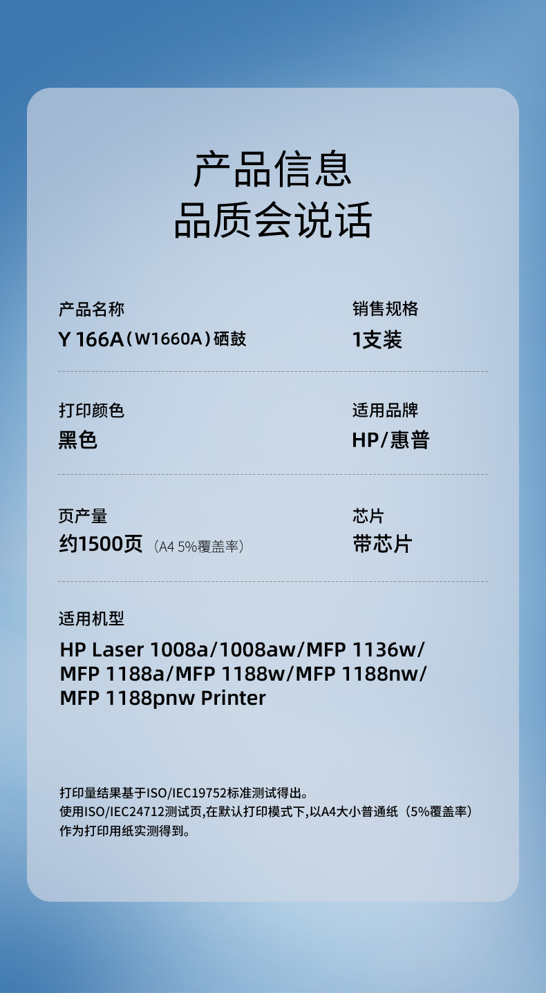 商品标题:印友 兼容Y 166A(W1660A) 硒鼓(鼓粉一体)(带芯片)黑色单支装(适用HP 1008a/1008aw/MFP1136w/MFP1188a/MFP1188w)打印量1500页(单位:支)