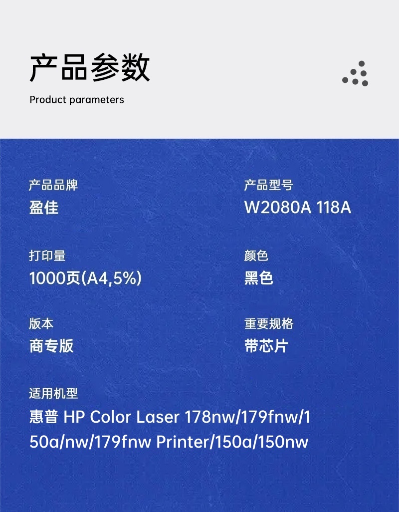 盈佳兼容W2080A 118A粉盒(鼓粉分离)商专版带芯片黑色单支装(适用于惠普 HP Color Laser 178nw/179fnw/150a/nw)打印页数:1000页(A4,5%)(单位:支)
