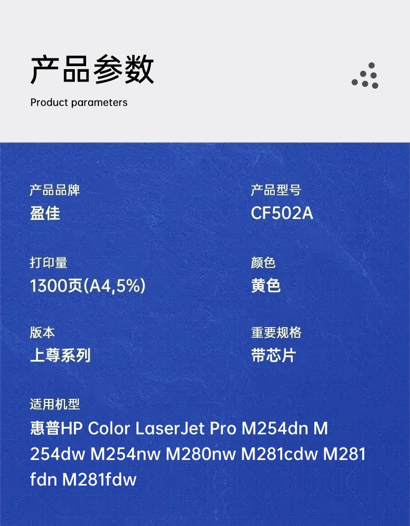 商品标题:盈佳 CF502A上尊系列 打印量1300页 适用惠普HP Color LaserJet Pro M254dw M245nw M281fd 硒鼓 黄色 (计价单位:支)