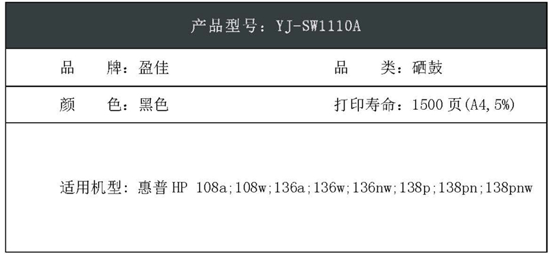 商品标题:盈佳 YJ-SW1110A 黑色硒鼓(支)