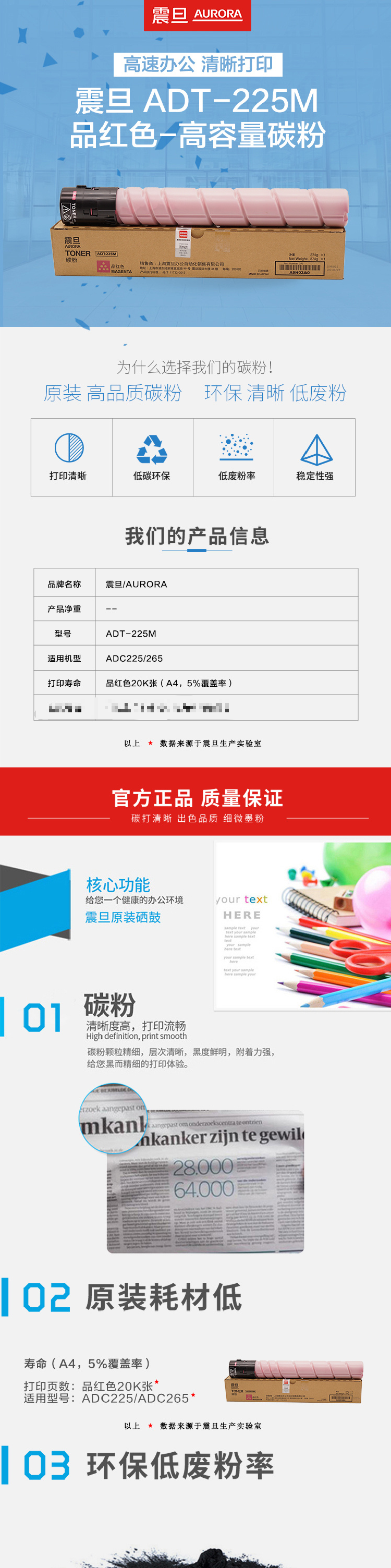 震旦(AURORA)碳粉ADT-225M 红色20K张(支)