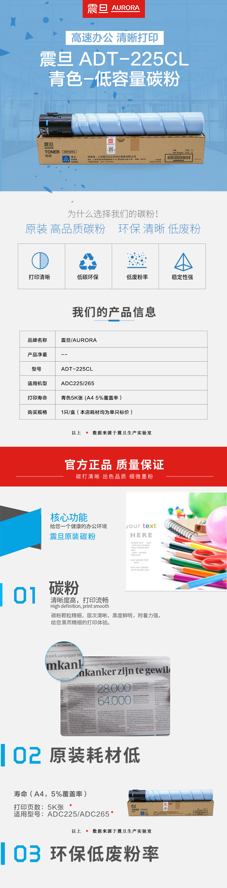 商品标题:震旦ADT-225CL碳粉低容量青色适用于ADC225/265(支)