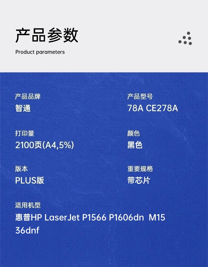 品牌:智通型号:78A CE278A商品标题:智通兼容78A CE278A硒鼓(鼓粉一体)PLUS版黑色单支装(适用惠普HP LaserJet P1566 P1606dn M1536dnf)打印页数:2100页(单位:支)销售单位:支类型:硒鼓打印页数:2100页(A4幅面5%覆盖率)适用机型:惠普HP LaserJet P1566 P1606dn M1536dnf重量:0.8kg