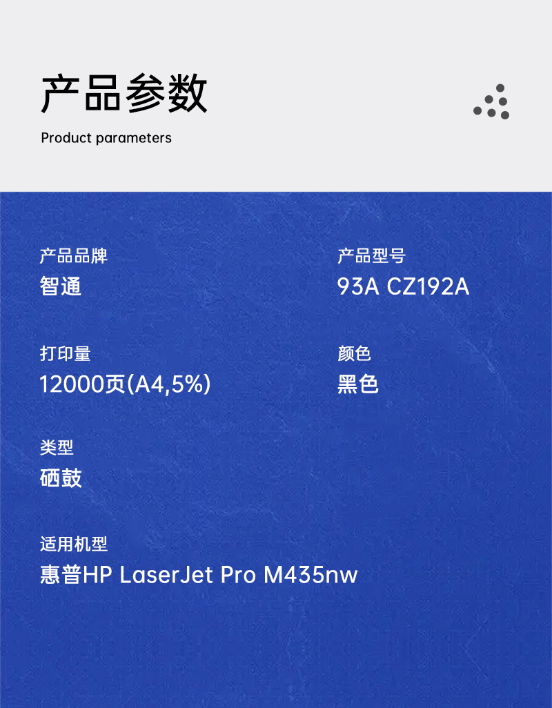 商品标题:智通兼容93A CZ192A硒鼓(鼓粉一体)带芯片黑色单支装(适用于惠普HP LaserJet Pro M435nw)打印页数:12000页(单位:支)