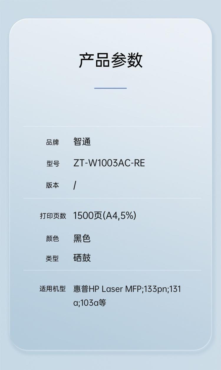 商品标题:智通ZT W1003AC(110AC)黑色硒鼓 适用于:惠普HP Laser MFP;133pn;131a;103a(支)