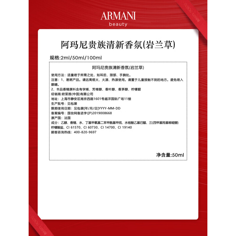 产品(注册/备案)名称:阿玛尼贵族清新香氛(岩兰草)