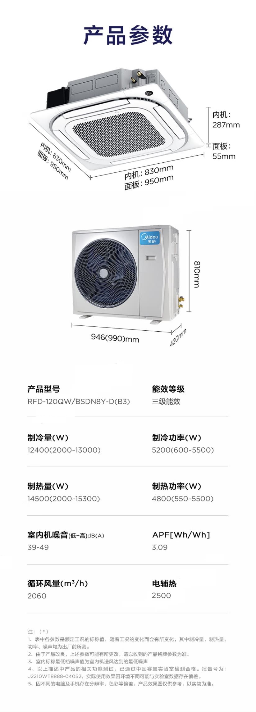 商品标题:美的(Midea)RFD-120QW/BSDN8Y-D(B3)A 5匹一拖一 嵌入式天花机(台)380V 【含基础安装不含铜管】