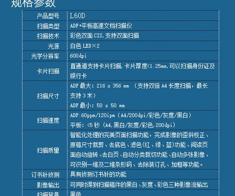 商品标题:哲林(Zhelin)L60D A4幅面 60PPM/120IPM 双平台扫描仪