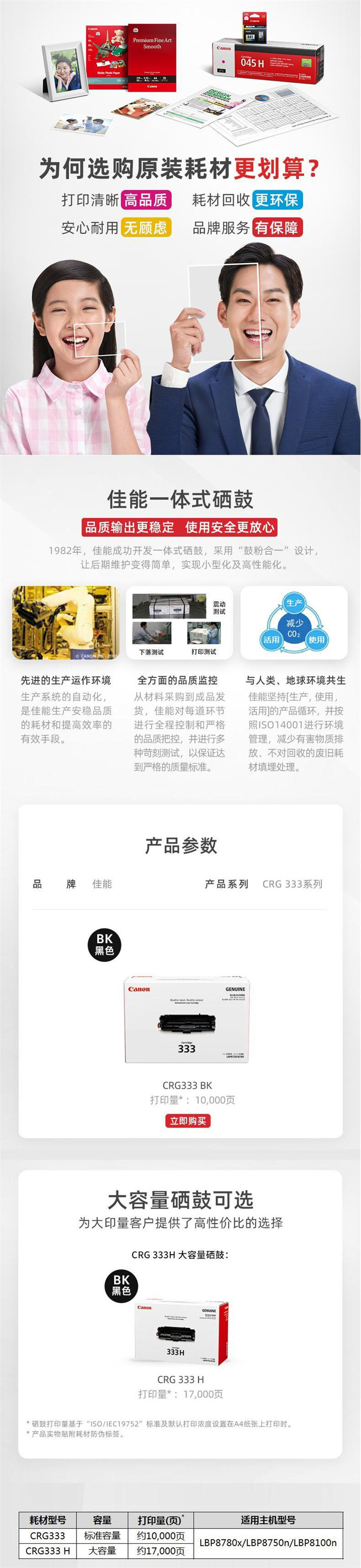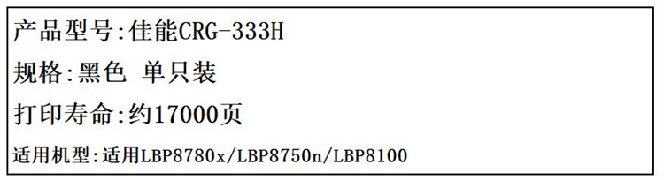 商品标题:佳能(Canon)CRG-333H 原装硒鼓(鼓粉一体) 黑色单支装(适用佳能LBP8780x/LBP8750n/LBP8100n)打印页数:17000页(单位:支)