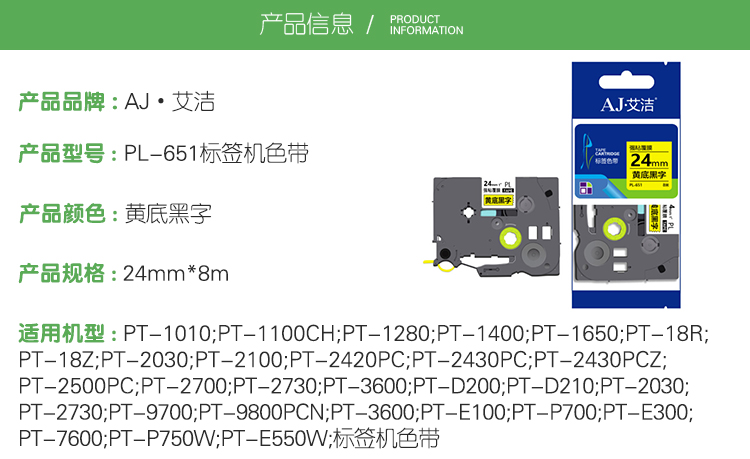 商品标题:艾洁PL-651兄弟标签机色带24mm黄底黑字(个)