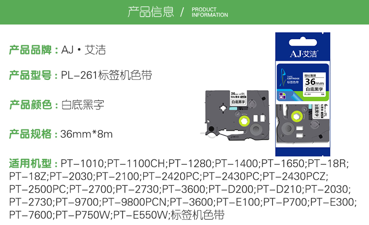 商品标题:艾洁PL-261兄弟标签机色带36mm白底黑字(个)