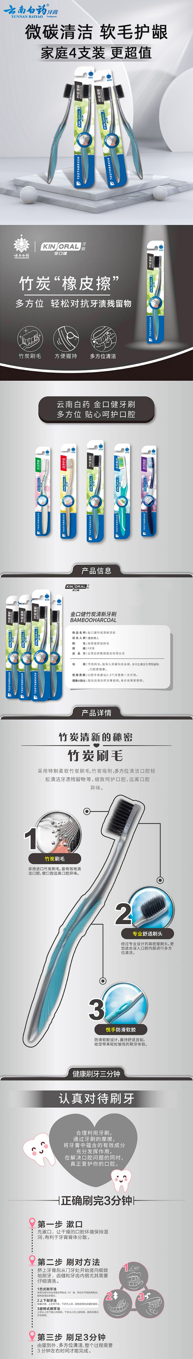 商品标题:云南白药金口健牙刷家庭装竹炭清新4支装(组)